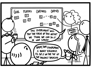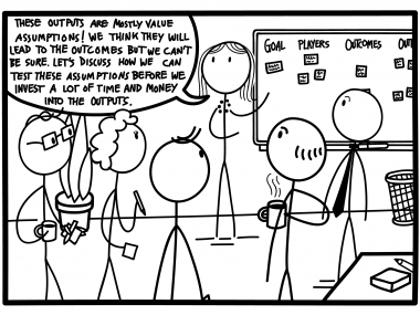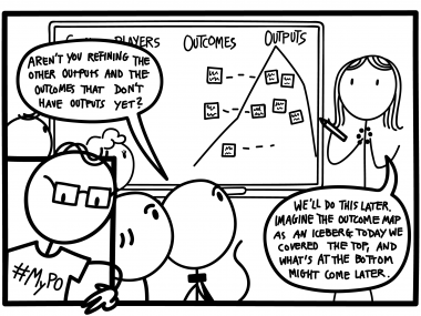 Shortly after that meeting, Bruce and Sharon met with the Scrum Team to refine the Product Backlog. The Scrum Team was already familiar with outcome mapping, so Sharon kept her explanation short: She emphasized that outputs are usually just assumptions of value. Like any assumption they need to see if it’s true, and so they should try to find out if building these outputs will actually lead to the outcomes we want.