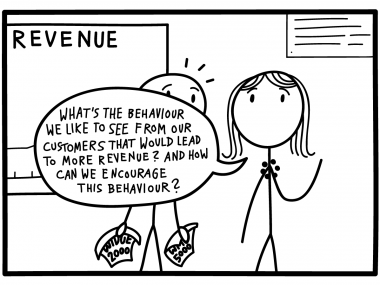 Sharon, the Product Owner isn’t convinced that more widgets will lead to more revenue. Instead, she suggests to take a step back and understand which customer behavior would lead to more revenue and what the organization would have to do to encourage this behavior.