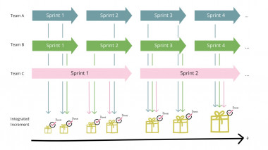 When multiple Scrum Teams work together to create a product, they create integrated Increments. This means that the work of all individual Scrum Teams is combined into an integrated Increment. If the Scrum Teams use the Nexus framework to scale Scrum, the Nexus Integration Team (NIT) is accountable that the Scrum Teams create an integrated Increment at least once every Sprint. Here's an example of what this might look like with three Scrum Teams in a Nexus: